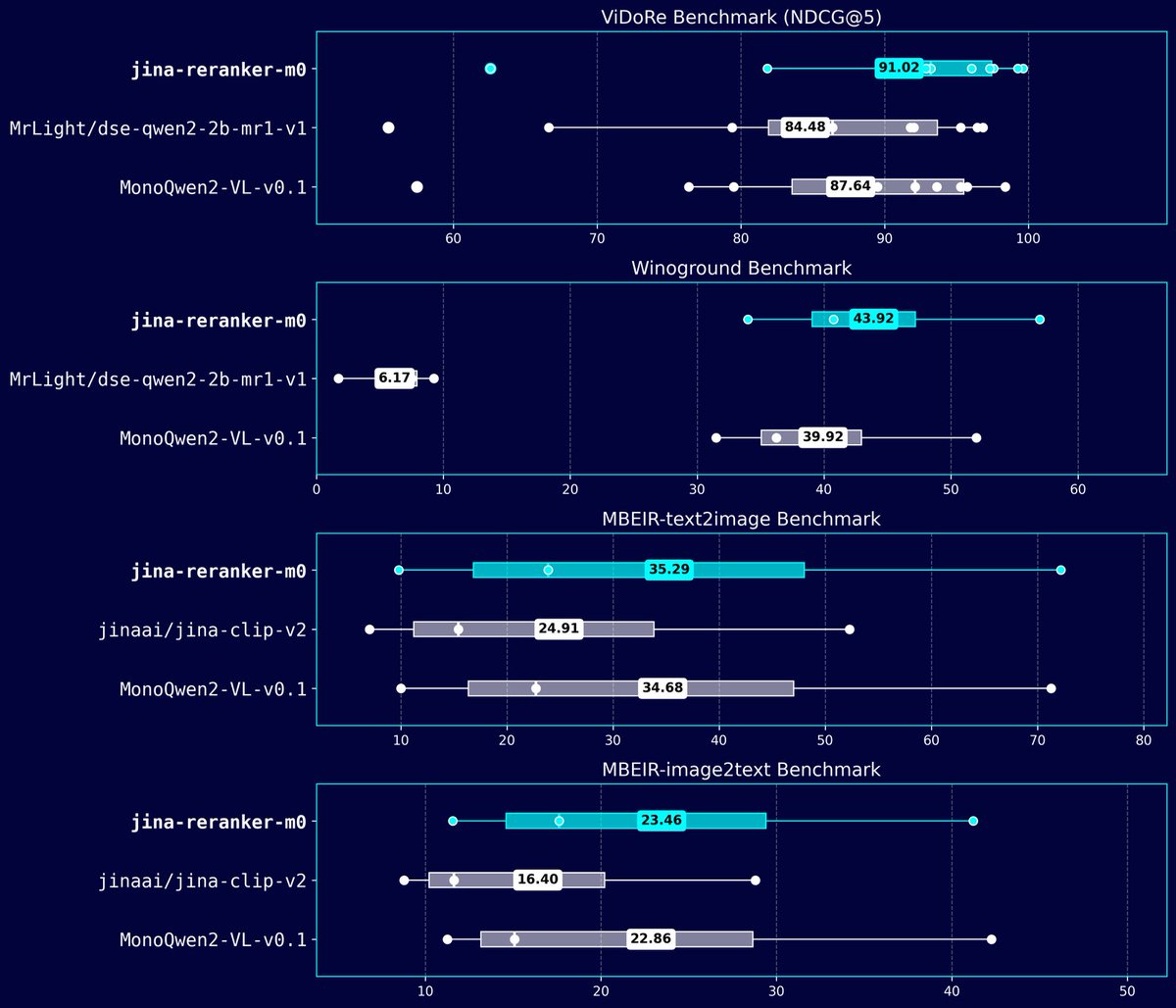 Check out the post and learn more about the benchmarks, huggingface model page, API. jina-reranker-m0 is our first attempt to unify textual and visual modalities in a decoder-only model. It opens up many new possibilities that weren't achievable with encoder-only rerankers. Try m0 and let us know what you think.jina.ai/news/jina-rera…