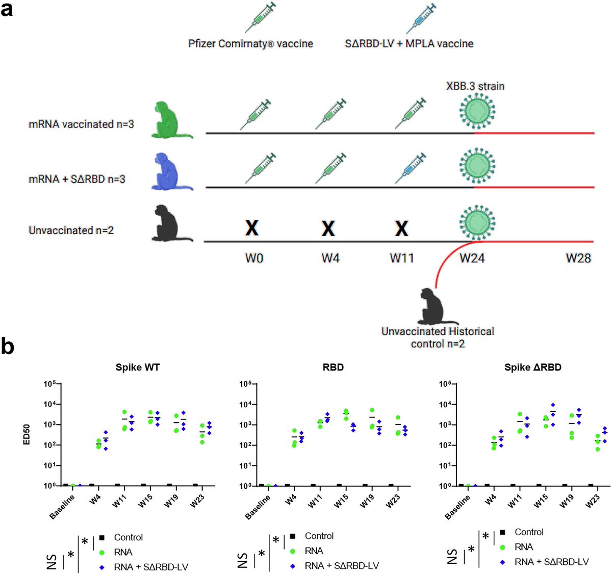Immunization of cynomolgus macaques either 3 times with the Pfizer mRNA vaccine or 2 times followed by SΔRBD-LV showed that the SΔRBD-LV boost induced similar antibody titers and neutralization of different variants, including omicron. 4/