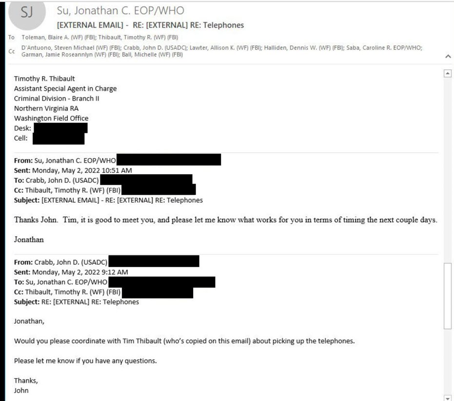 Su arranged the pick up of the devices from Biden WH in May 2022. Again underscoring this is the same time Su was working with NARA to devise the classified documents case, meeting with NARA officials at WH.