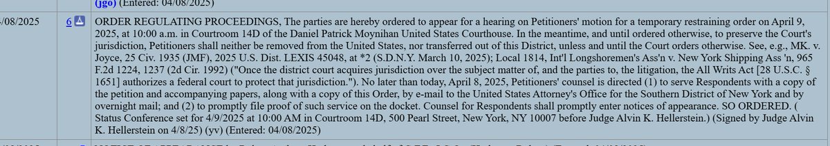 🚨🚨Two of the aliens who sued Trump Administration before to challenge their removal under the Alien Enemies Act were apparently brought back to New York for detention & thus filed a habeas case there. Strangely docketing is in an older case w/ habeas petition sealed. 1/