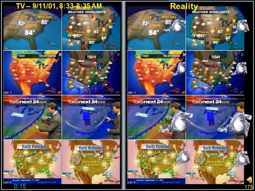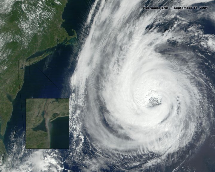 Hurricane Erin (category 3) traveled in a straight line towards New York City for 4-5 days from September 7th-11th 2001, reaching its closest point to land, just off the coast, on the morning of 9/11/2001. Despite Hurricane Erin's threatening trajectory, we suspiciously weren't warned by most corporate news broadcasts in the days leading up to 9/11, or on the morning of 9/11. When most corporate news channels displayed schematic weather maps of the northeast U.S. coastline, Hurricane Erin was not shown. Hurricane Erin was similar in size to Hurricane Katrina and similar in strength to Hurricane Sandy (category 3), and hurricanes rarely head straight for NYC, yet we weren't warned by most corporate news outlets that Hurricane Erin was heading straight for densely populated New York City.