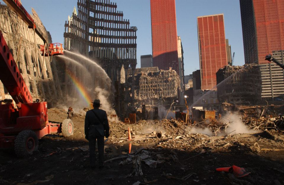 October 28th, 2001. Looking east, through the core of WTC1, there is still fuming from the wet dirt. Note the puddle in the foreground. There are pools of water under a beautiful rainbow. Those orange-rusted core columns are very bright. If AVIRIS thermal imaging shows that fires were out and temperatures were no longer hot by September 23rd 2001, why is the ground still fuming and being hosed down? facebook.com/photo.php?fbid…