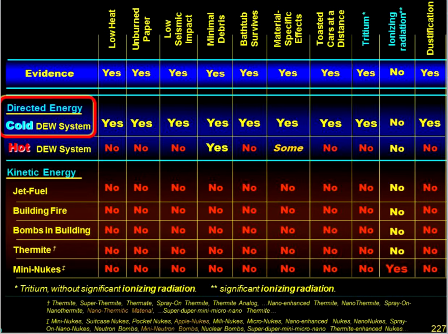 4) Only the general category of weapon technology known as 'directed energy weapons' (DEW) can successfully explain all of the forensic evidence from 9/11, and it does so completely and irrefutably, while nothing else comes close. (FACT)