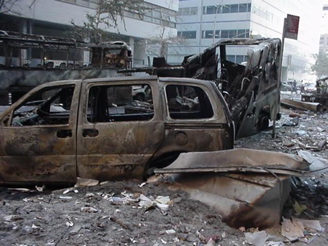 "Toasted" cars in the lot northwest of the WTC complex. There is little visible rust, so this photo was probably taken within a day or two of 9/11/01. If the dust clouds from the WTC towers were not hot enough to burn pedestrians, paper, or cars, why were there so many 'toasted' cars after 9/11? facebook.com/photo.php?fbid…