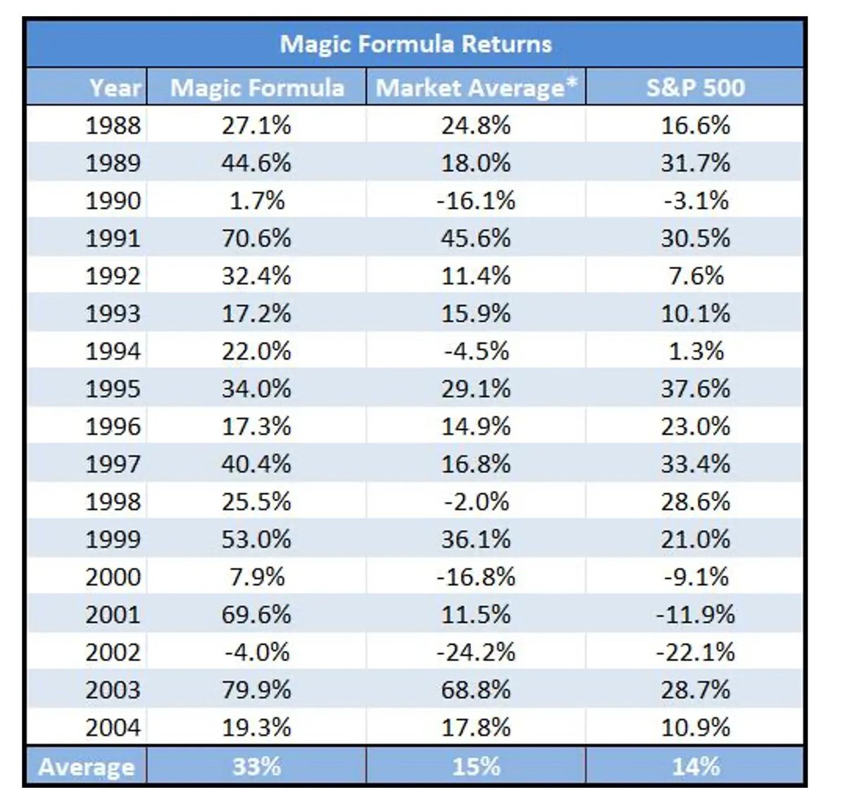 Between 1988 and 2004, this simple formula returned 33% annually.
