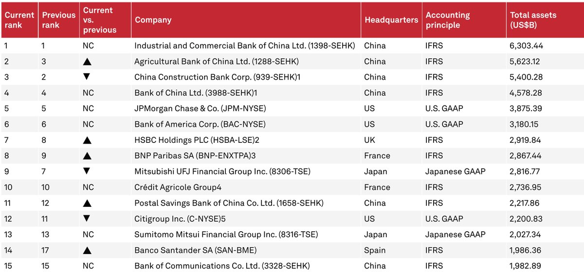 Everyone thinks the US dominates in banking, but in reality 4 of the top 5 banks are Chinese. ICBC has 60% more assets than JP Morgan.