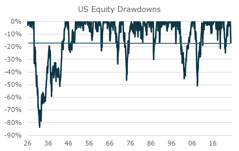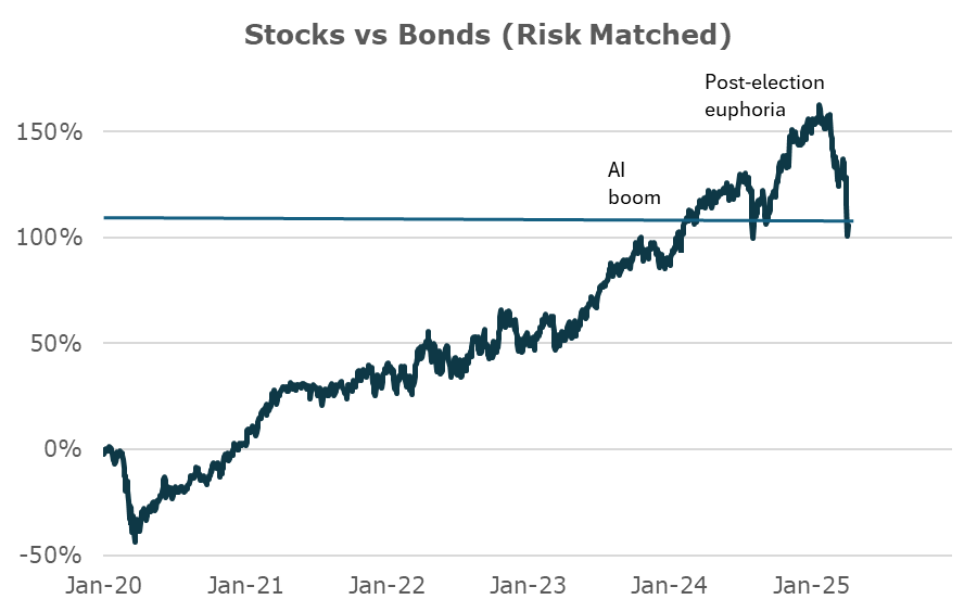 Just looking at the drawdown chart fails to consider the lofty heights stocks started at coming into this period. Stocks are up 100% vs risk-matched bonds in recent years and the moves mostly reversed post-election euphoria. (vol-matched returns should be zero over time)