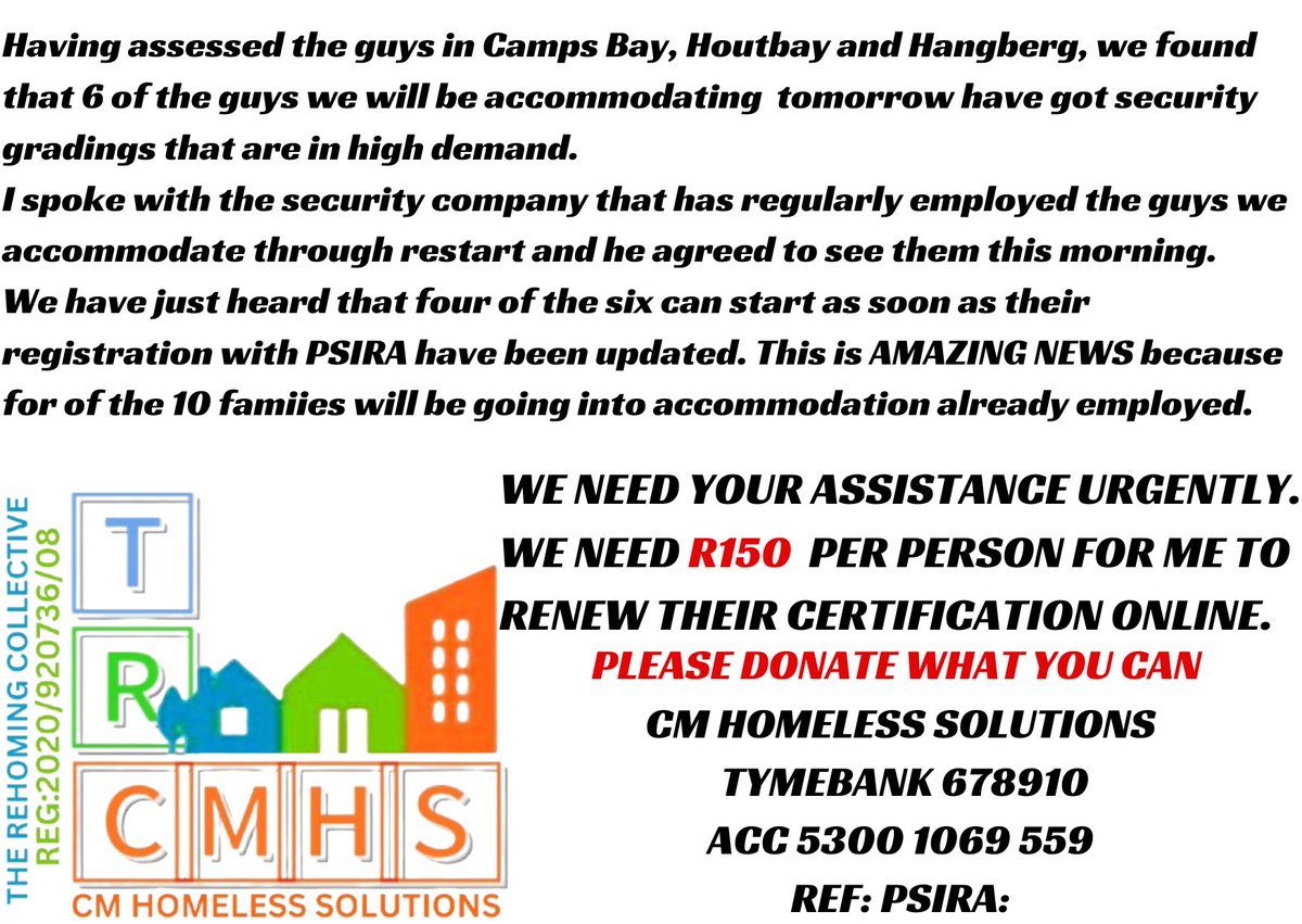 Having assessed the guys in Camps Bay, Houtbay and Hangberg, we found that 6 of the guys we will be accommodating tomorrow have got security gradings that are in high demand.