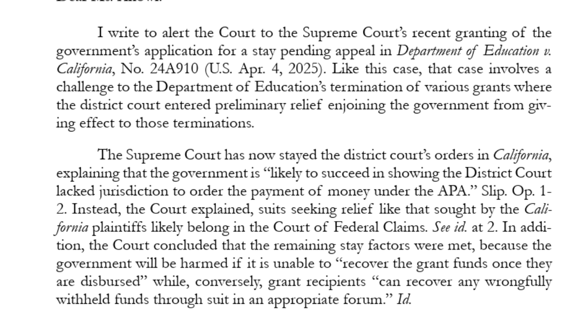 2/ Lower court had ordered Trump to pay DEI grants. SCOTUS had stayed similar injunction, prompting Fourth Circuit to do so too. Again, this is order being made of chaos by SCOTUS & appellate courts halting improper injunctions by district court judges.