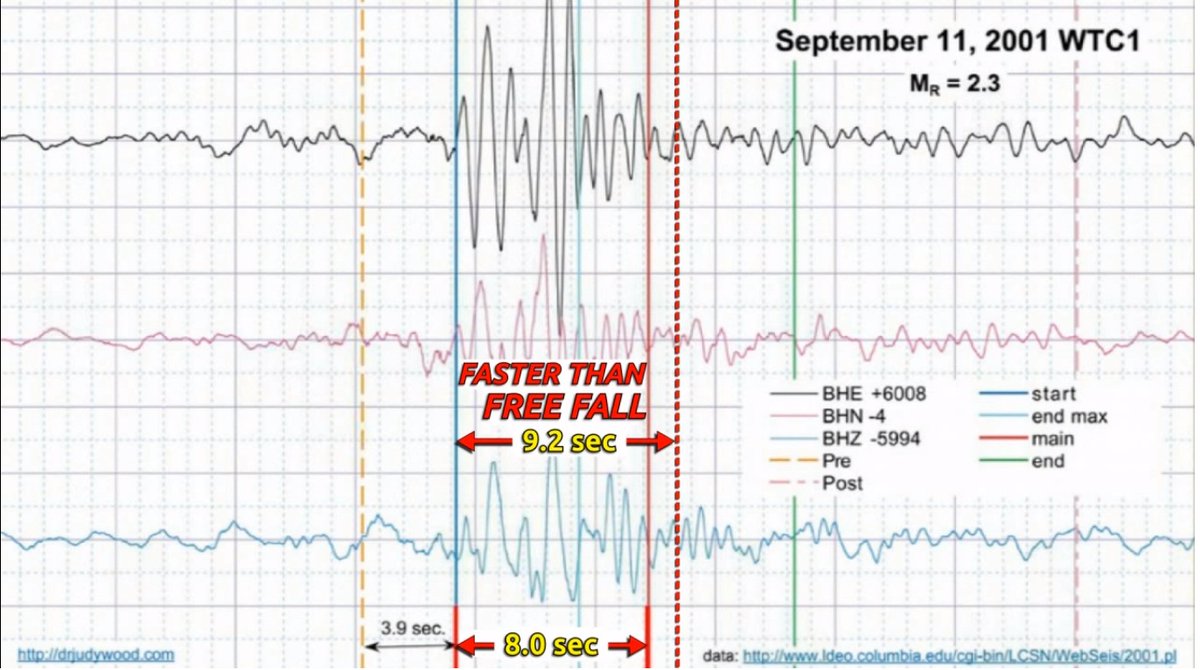-Columbia University's Seismology Group recorded seismic events of 10 seconds and 8 seconds in duration, which correspond to the destruction of WTC2 and WTC1. In comparison, if a billiard ball was dropped from the roof of WTC1 (North Tower) it would take approximately 9.22 seconds to hit the ground. Why was the seismic activity from the WTC destruction so brief? Furthermore, the destruction of each tower should have registered as magnitude 3.8 or greater on the Richter scale, so why was the seismic activity from the WTC destruction so weak? facebook.com/photo.php?fbid…