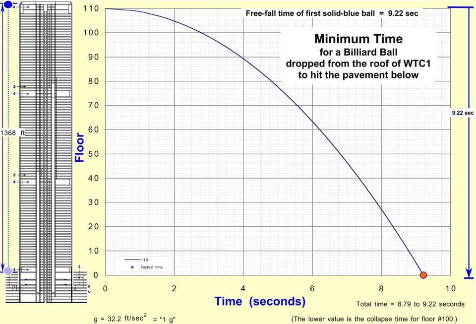 From the rooftop of WTC1, drop one (dark-blue) billiard ball over the edge. As it falls, it accelerates. If it were in a vacuum, it would hit the pavement, 1368 feet below, in 9.22 seconds, shown by the blue curve in the figure, below.