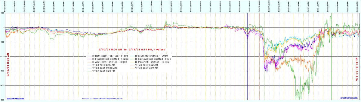 University of Alaska magnetometer stations detected normal readings in the days leading up to 9/11, but detected a significant electromagnetic disturbance in the Earth's magnetosphere precisely as the 9/11 attacks occurred. This chart was plotted by Dr. Judy Wood using the raw University of Alaska magnetometer data found at the source link below, for better visual comparison of the data. A link to a larger version of this graph is also available below. Why were there significant fluctuations in the Earth's magnetosphere at the very same time of the 9/11 attacks, as recorded by 6 different University of Alaska magnetometer stations? facebook.com/photo.php?fbid…