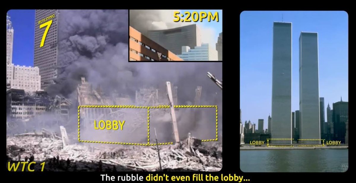 Where did all the rubble go? Why wasn't the WTC lobby buried by the ~110 stories above it? Why was the rubble pile at ground zero only 1-3% of the original WTC tower height (~3% at its tallest point)? Even buildings that were emptied and gutted before undergoing controlled demolition with thoroughly planted explosives leave a rubble pile of at least ~12% of the original building height, so why is the ground zero rubble pile only 1-3% of the original WTC twin tower height? Where is all the office furniture? Office machinery? Computers? Filing cabinets? Book shelves? Wall board? Doors? Concrete floors? Toilets? Where did all the rubble go?