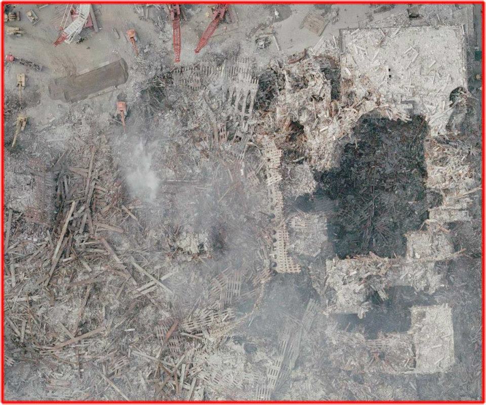 September 27th, 2001. No longer "venting," the pile is now just "fuming." A hazy cloud of fumes wafts up from the WTC1 and WTC2 "piles". Where is it coming from? It does not seem to originate from a single point, but instead rises over a wide zone in a fairly uniform, hazy fashion. If AVIRIS thermal imaging shows that fires were out and temperatures were no longer hot by September 23rd 2001, why is the ground still fuming and being covered with dirt? Most of WTC3 disappeared during the destruction of WTC1, and the pedestrian walkway over the West Side Highway was connected to something that is no longer there. The remains of WTC2 can be seen near the center of the photo and the remains of WTC1 are partly visible in the lower right corner. Notice the distinct columns of the WTC tower lobby. facebook.com/photo.php?fbid…