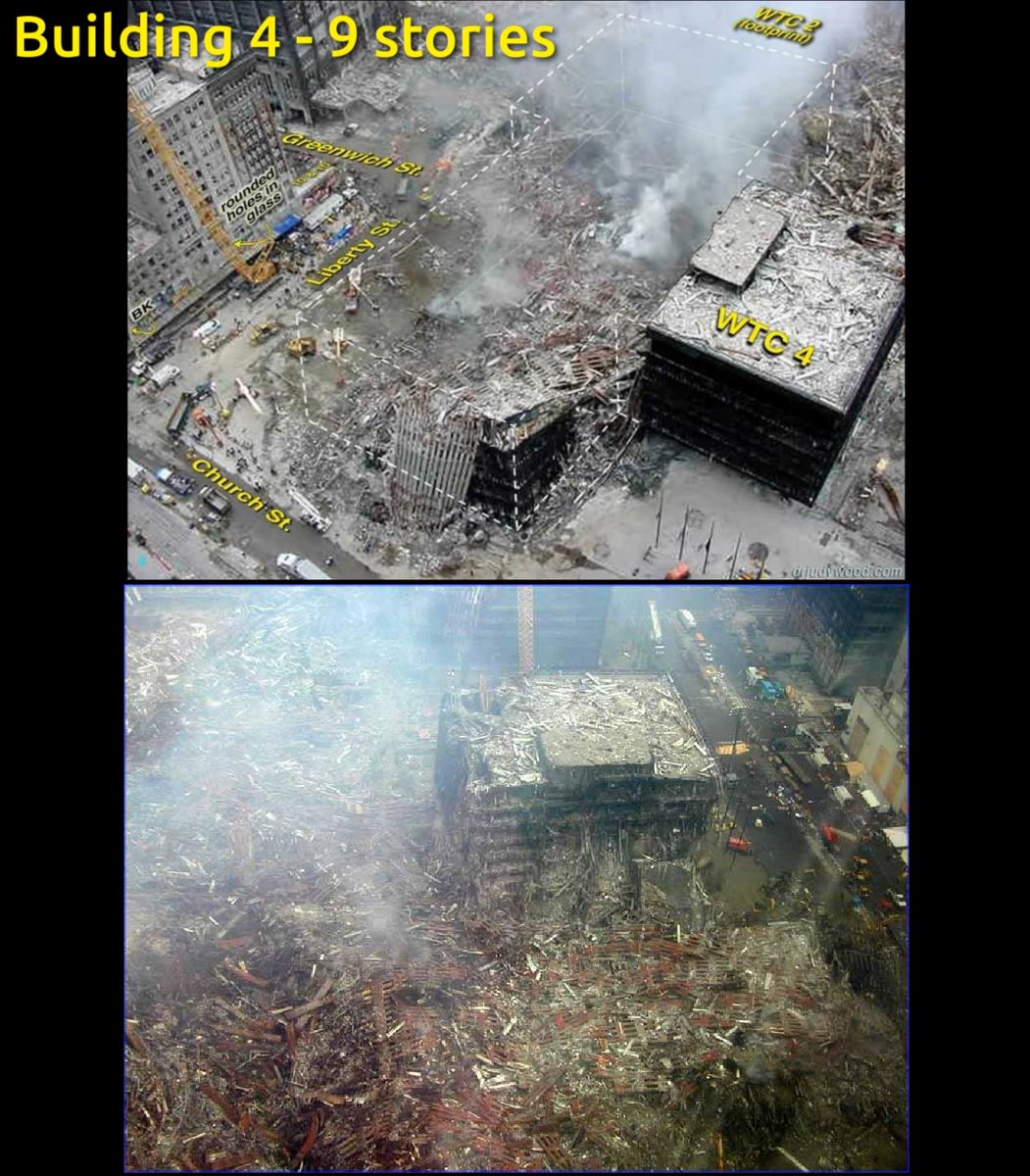 This photo was taken around noon on 9/11/01, and is the same photo as the next one but with added yellow lines to emphasize the height of WTC6 compared to the tallest portion of the WTC1 "rubble pile," which is seen in the foreground. Where did the towers go? Compare this image to the previous one. WTC6, an 8-story building, towers over the "rubble pile" remaining from WTC1 and 2. WTC7 can be seen in the distance as it has not yet been destroyed. The Verizon Building is at a distance on the left. Why is the WTC rubble pile so small? Where are the concrete floors? Where is the office furniture? Where is the office machinery? Where are the filing cabinets? Where is the wall board? Where are the bookcases? Where are the toilets? If the Seattle Kingdome left a debris pile approximately 12% of its original height after being destroyed via controlled, explosive demolition, then why was the debris pile from the "collapse" of the WTC twin towers only a few stories high, approximately 2-3% of their original height (110 stories)? facebook.com/photo.php?fbid…