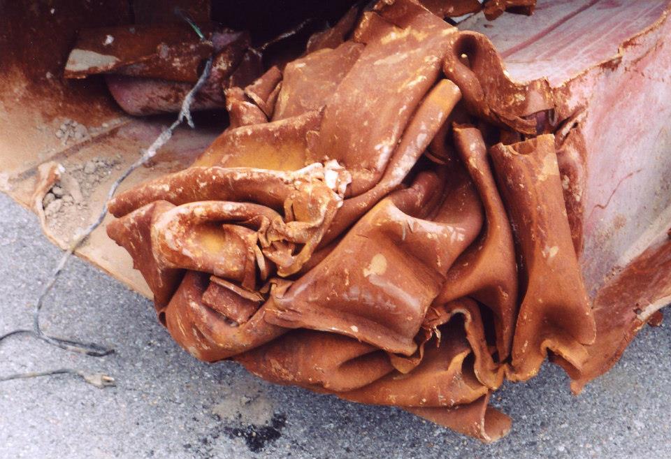 Shriveled steel from previous image. This person appears to be taking a sample of the steel for analysis. Notice the unusual shriveled appearance of this steel beam, and the presence of rust. Heat from jetfuel or explosives do not explain this, so what could have caused this steel beam to shrivel? facebook.com/photo.php?fbid…