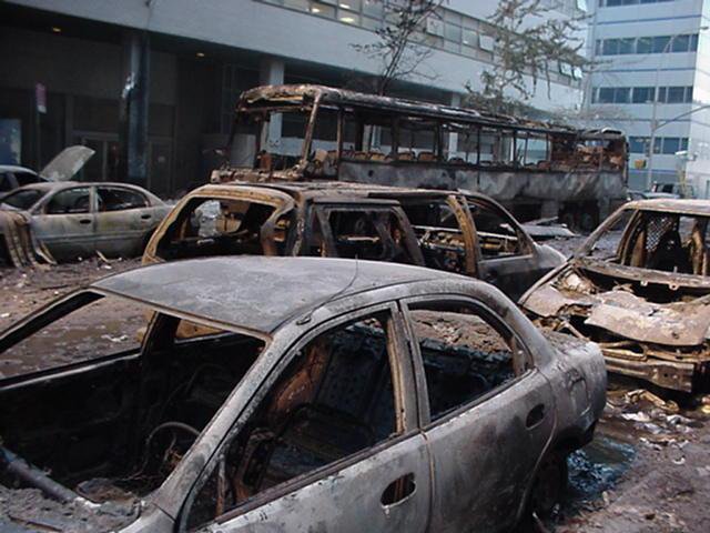 "Toasted" cars in the lot northwest of the WTC complex. There is little visible rust, so this photo was probably taken within a day or two of 9/11/01. If the dust clouds from the WTC towers were not hot enough to burn pedestrians, paper, or cars, why were there so many 'toasted' cars after 9/11? facebook.com/photo.php?fbid…