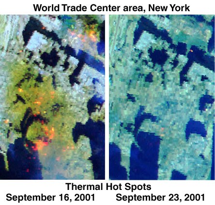 USGS Thermal Figure 1. Results of NASA Airborne Visible/Infrared Imaging Spectrometer (AVIRIS) remote sensing data and interpretations show the distribution and intensity of thermal hot spots in the area in and around the World Trade Center on September 16 and 23, 2001. Hot spots show as orange and yellow areas. Dozens of hot spots are seen on September 16, but most had cooled or the fires had been put out by September 23. Why did the fuming at ground zero continue for years after this time? What can cause long-term fuming without generating significant heat? : facebook.com/photo.php?fbid…