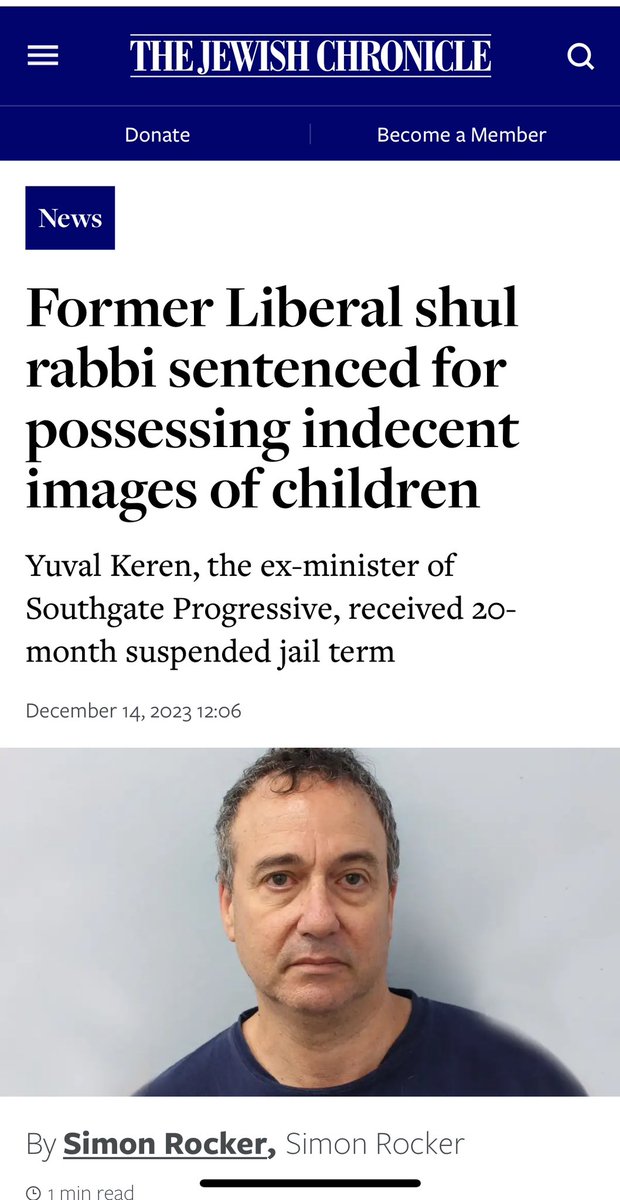 Yuval Keren, the former rabbi of Southgate Progressive Synagogue, has received a 20-month suspended jail sentence for possession of hundreds of indecent images of children.
