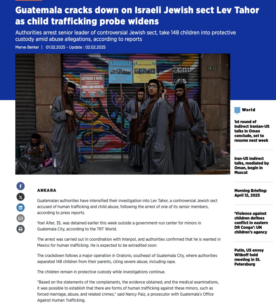 Then of course there is the Lev Tahor cult. Started in 'Israel', it moved to Canada and the US and was eventually chased out to Mexico and Guatemala. It's 'anti-Zionist'. By which we mean 'Jewish supremacist'. We all need to get used to thinking through the fact that most (almost all) Hasidic anti-Zionist groups are in fact Jewish supremacist groups (including the Satmar).