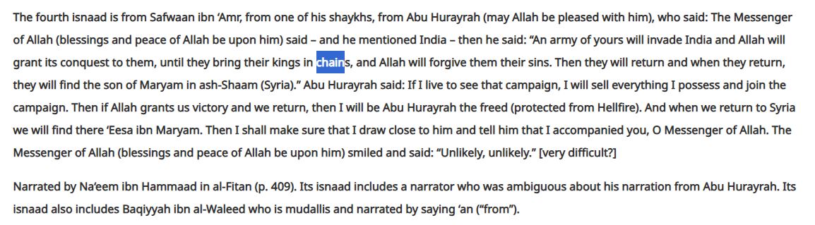 “A group of you will conquer India, Allah will open for them (India) until they come with its kings chained – Allah would forgive those warriors – when they return back (from India), they will find Isa ibn Maryam in Syria”.