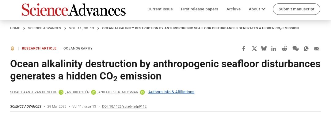2/ The seafloor contributes to 40% of the ocean’s alkalinity, which plays a key role in the ocean’s capacity to sequester atmospheric CO₂. However, human activities like mobile bottom-contact fishing (e.g., trawling) and dredging are disturbing this natural carbon sink.