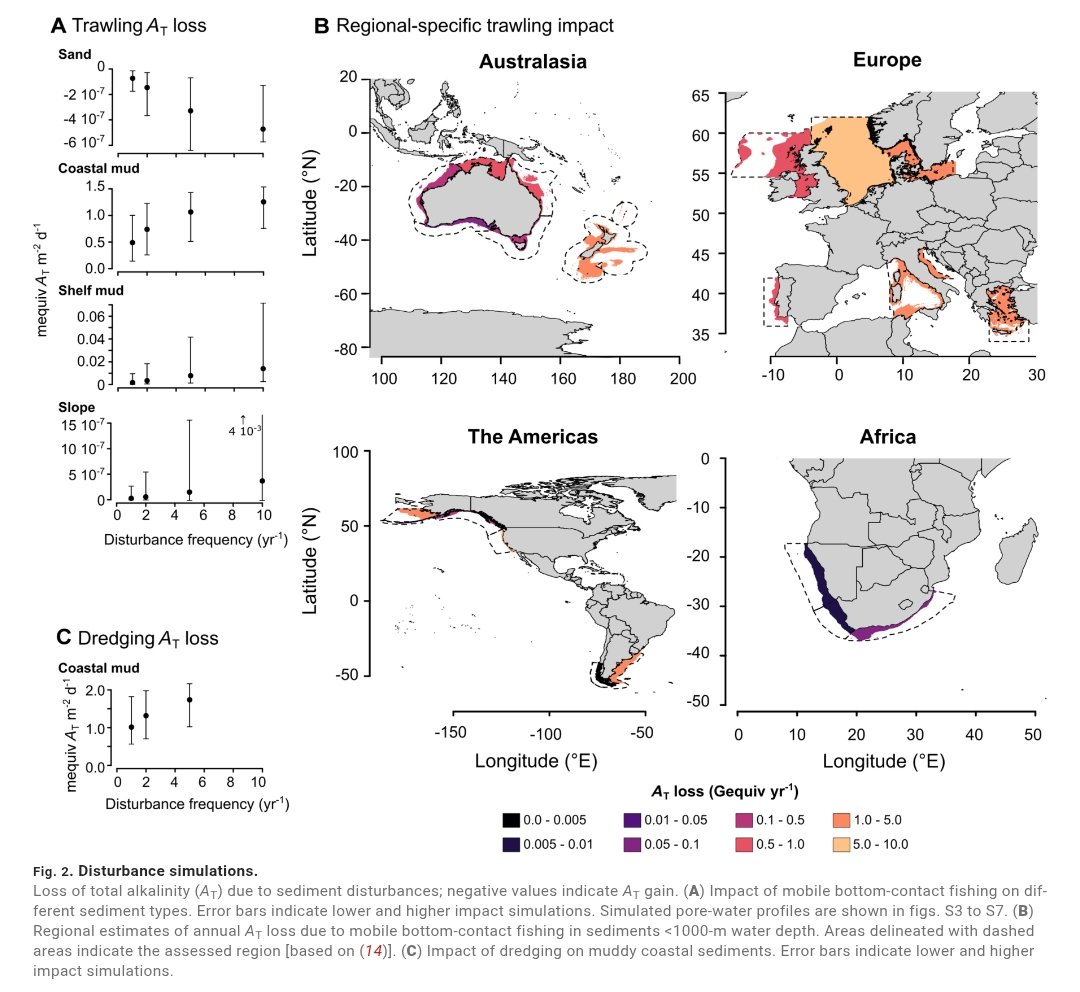 Bottom trawling alone reduces alkalinity production by around 130 [55–220] Gequiv/yr, while dredging contributes an additional 1.5 [0.8–2.7] Gequiv/yr. Combined, these activities lead to a net loss of 130 [56–220] Gequiv/yr.