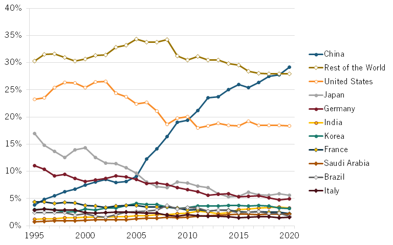 China's chemical value added increased from 8% in 2005 to 29% in 2020.