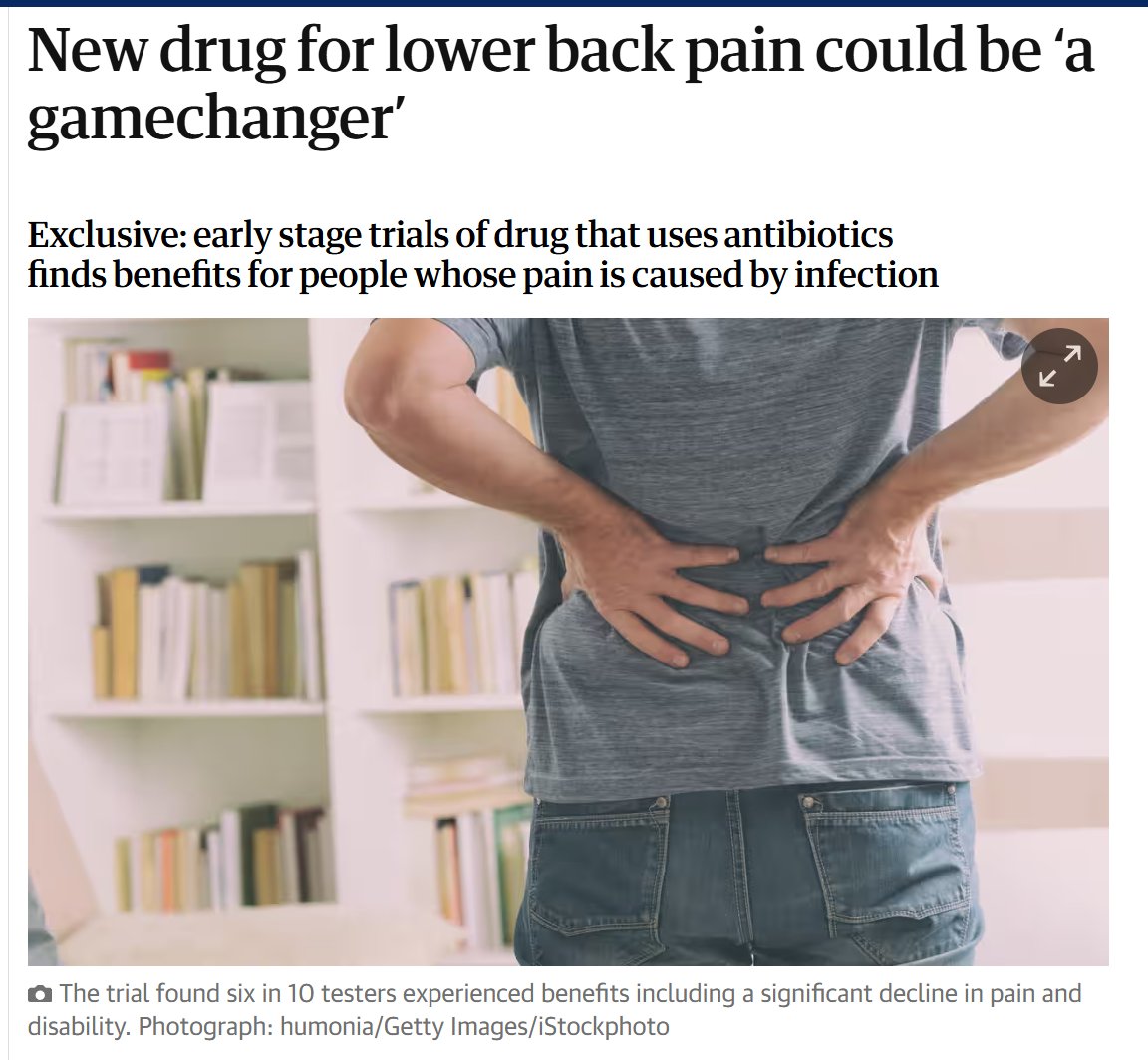 You may or may not have seen a couple of the recent news stories about a potential remedy for *some* back pain triggered by infection.