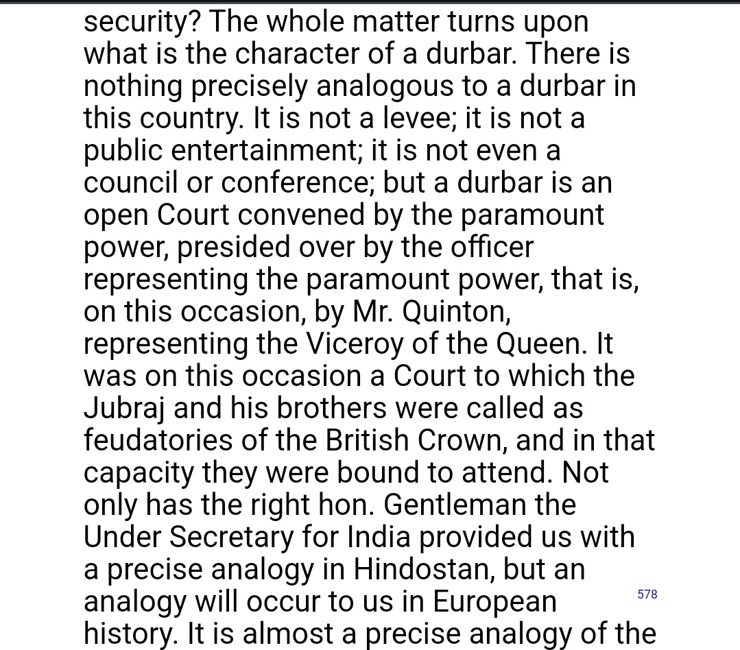 "A durbar is an open Court convened by the paramount power,presided over by the officer representing the Queen. It was on this occasion,a Court to which the Jubraj & his brothers were called as feudatories of British Crown& in that capacity they were bound to attend"