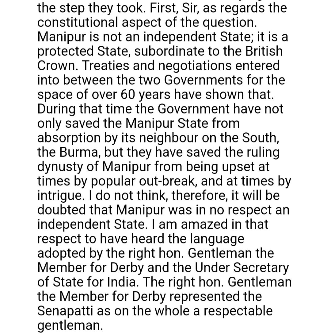 "Manipur State is practically our own creation. In 1826,we first recognised as a ruling Sovereign the Rajah of Manipur,We've always interfered with its internal affairs&the State has always acknowledged our suzerainty& sovereignty"