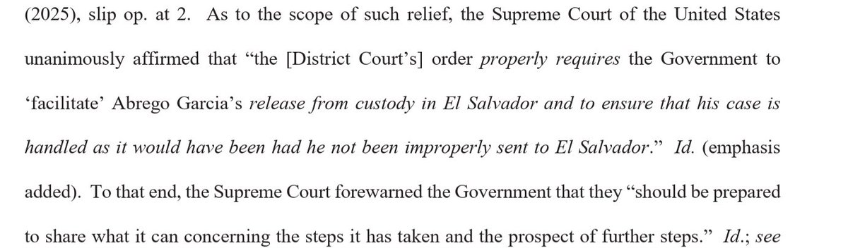 2/ Court continues to assume Garcia is held in El Salvador because we requested it and we are paying for it. DOJ needs to clarify that is NOT the case or if it is case, they'd be wise to immediately tell El Salvador are prior request is rescinded & no longer paying for it.