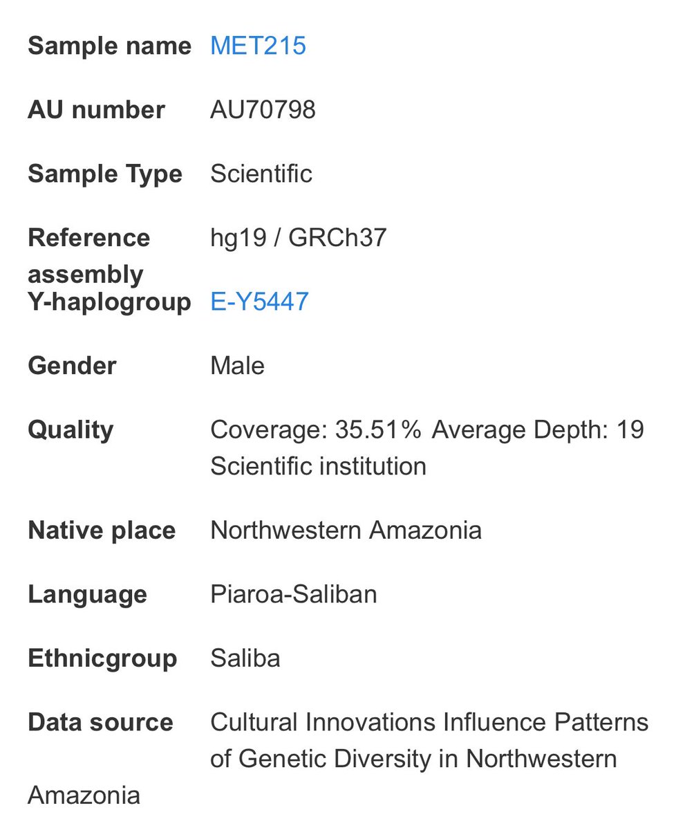 1/ دراسة جينية مختصة بـ ثقافات و جينات شمال غرب الأمازون تضمنت عينة MET215 التي تنتمي إلى التحور E-Y141317 من السلالة E-V1515.