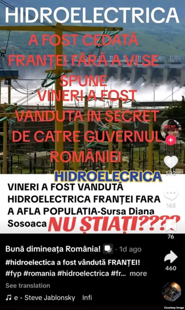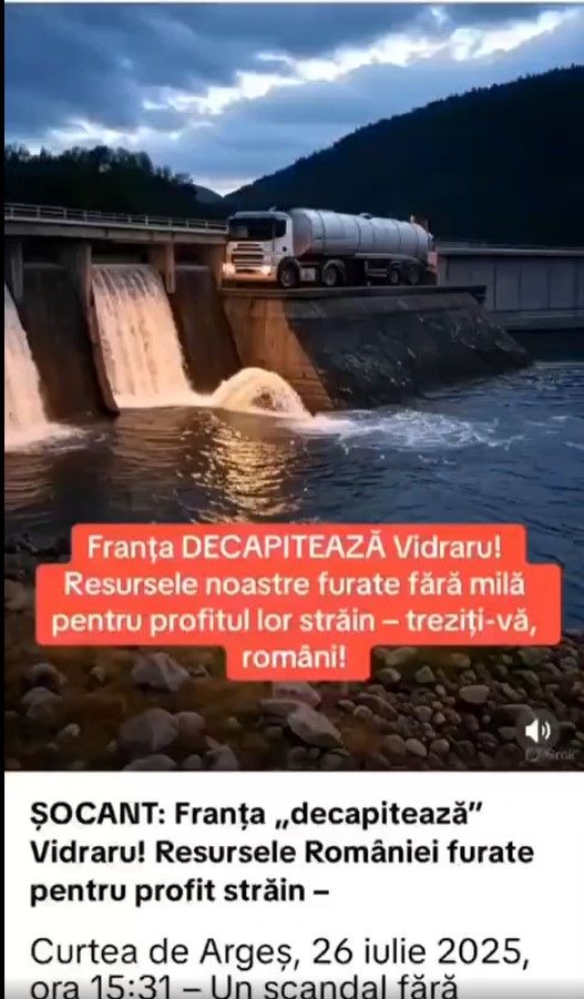 Soon after, a new campaign surfaced on TikTok, claiming that Hidroelectrica had been sold to France or that water from Vidraru Lake was being transported to France by train.