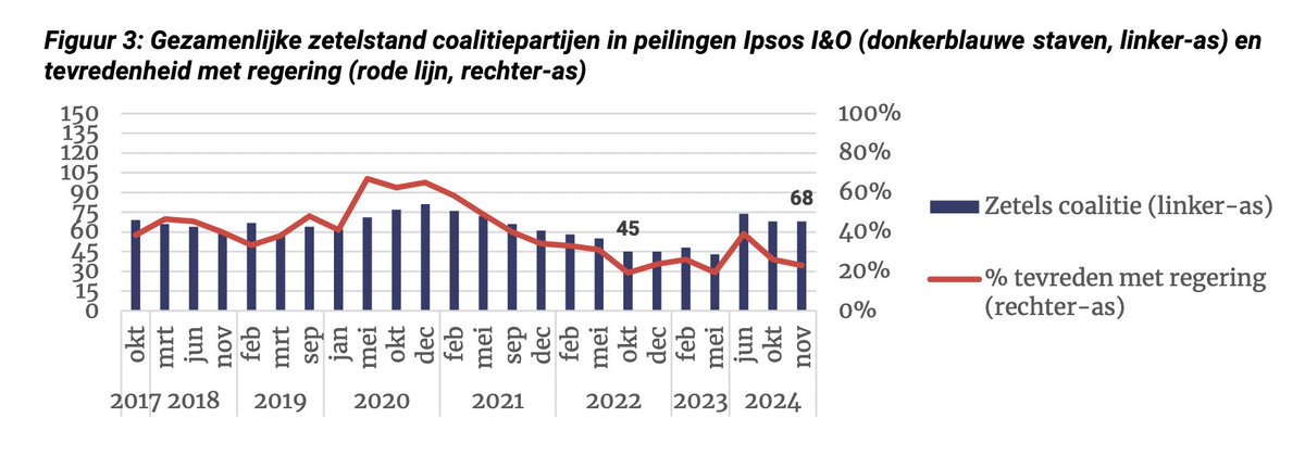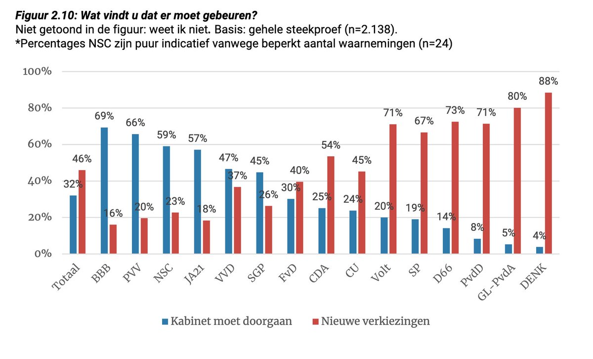 Удовлетворённость кабинетом падает среди всех крупных партий и партий коалиции. Даже для избирателей PVV и BBB копиума уже перестаёт хватать.