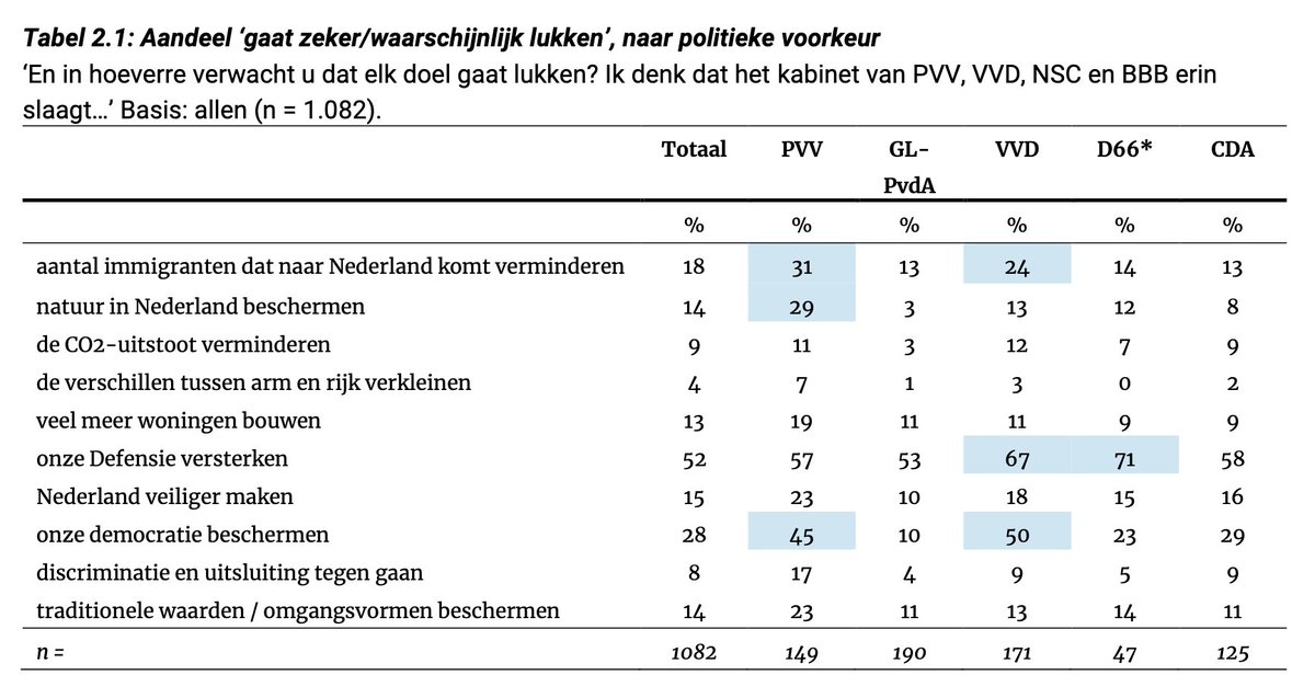 Примечательно, что избиратели GL-PvdA в ноябре 2023 года по-прежнему были настроены явно негативно (баланс -30; не показано в таблице) относительно управления страной вместе с VVD. Похоже, это отвращение исчезло.