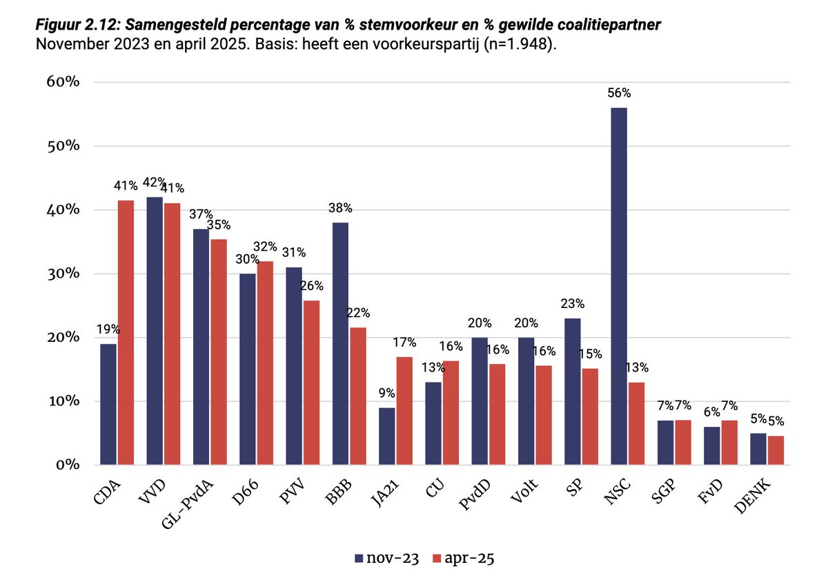 Избиратели слева направо (за исключением DENK, PVV и FvD) в целом положительно относятся к участию CDA в кабинете. В свою очередь, избиратели CDA поддерживают сотрудничество только с GL-PvdA, D66, CU, NSC и VVD. PVV и BBB могут рассчитывать на положительный баланс только среди избирателей на крайне правом фланге. В ноябре 2023 года избиратели VVD все еще были позитивно настроены относительно работы с PVV (тогда +9), но сейчас этот показатель значительно снизился (-24).