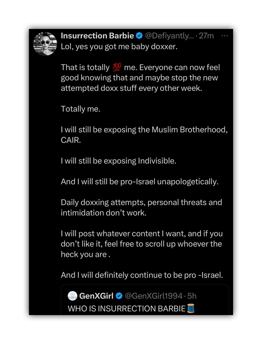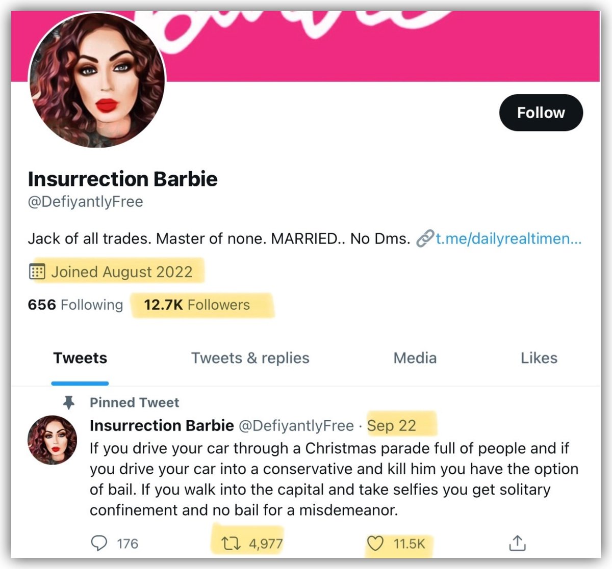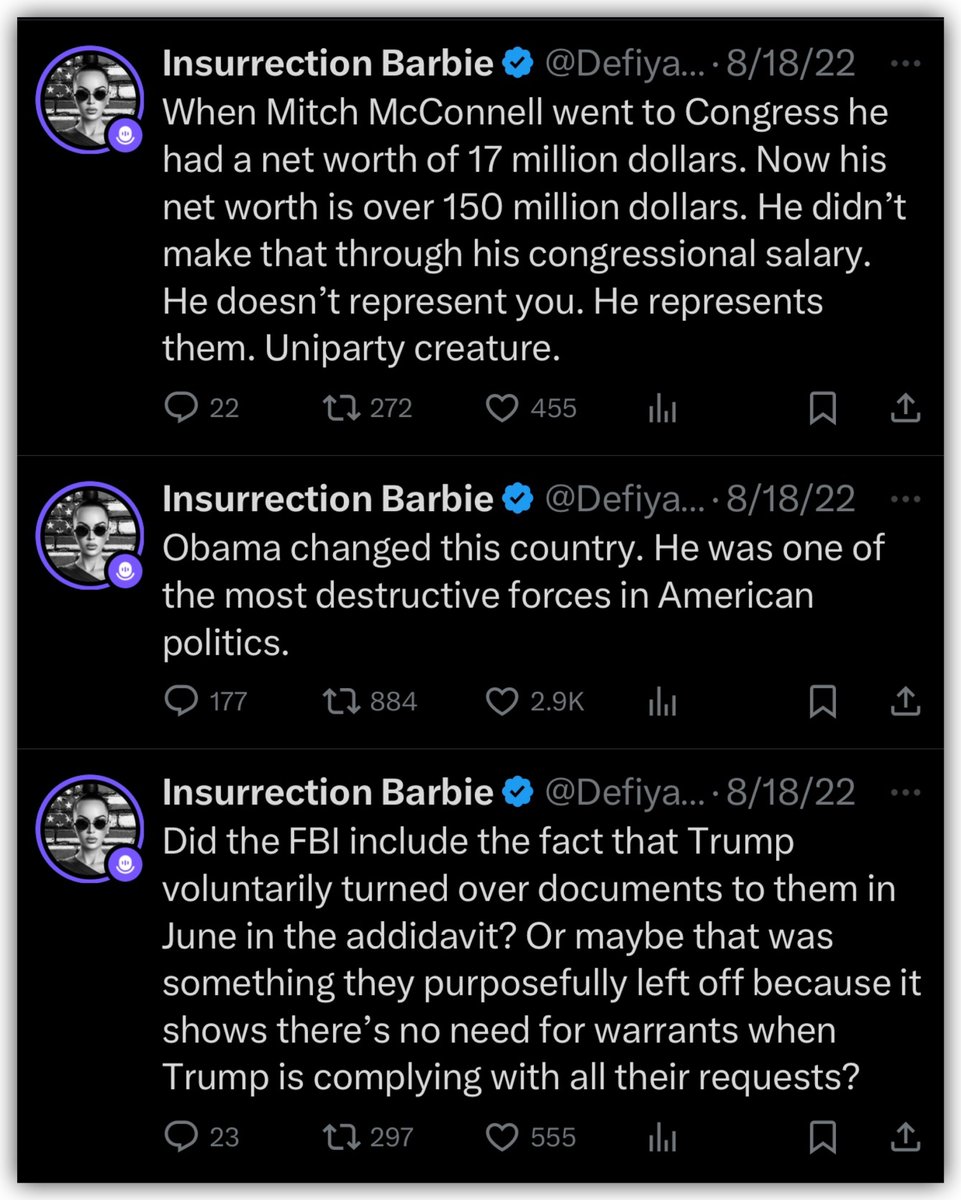 Insurrection Barbie’s oldest post is on August 18, 2022. Her first 3 posts garnered significant likes and reposts. Idk about you guys, but my first posts on X barely got any views let alone likes and reposts. So it’s very strange that on her first day, X users flocked to her