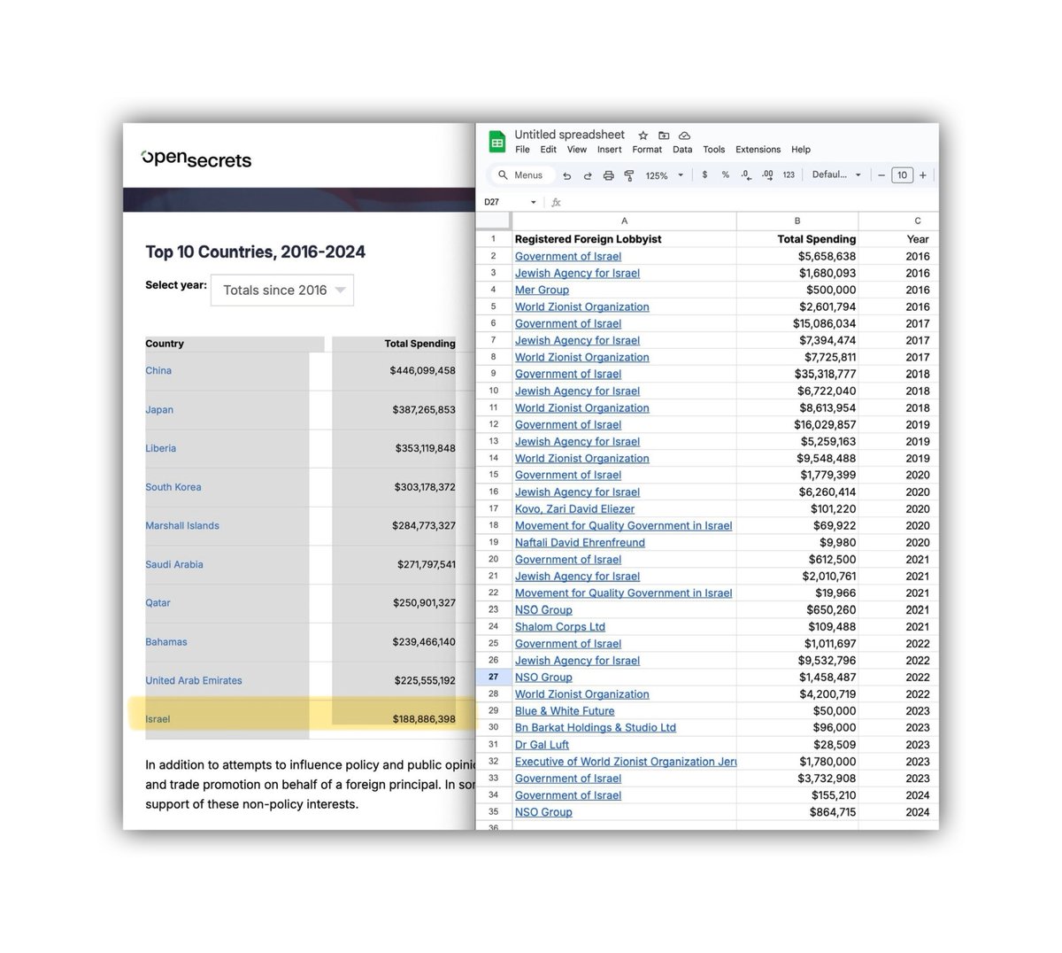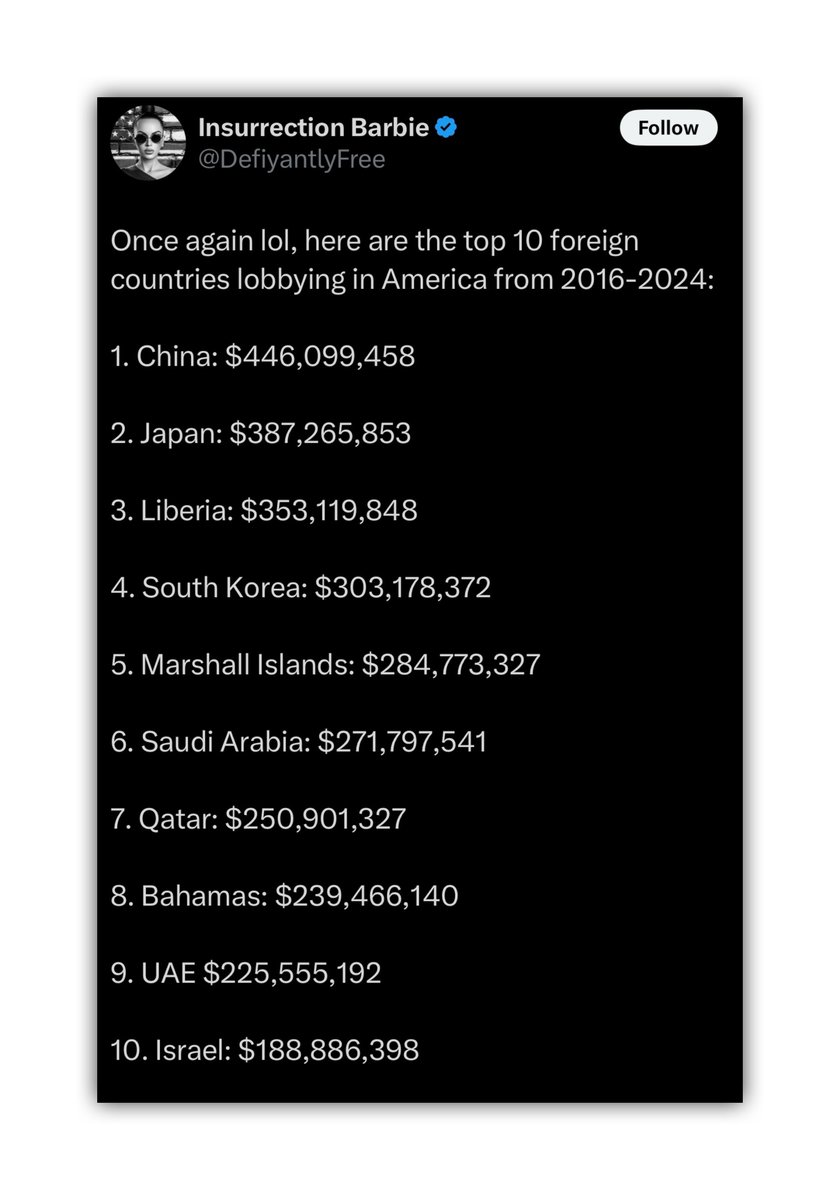 Many of her posts are coordinated campaigns with other Israel propagandists. This is an example of her downplaying Israel lobby’s donations to elected officials by selectively posting the list of donations from FARA registered Israel lobby which is only 12 orgs. This is highly deceptive b/c it excludes most of the Israel lobby which does not registered under FARA. Nonetheless, this claim has been trending.