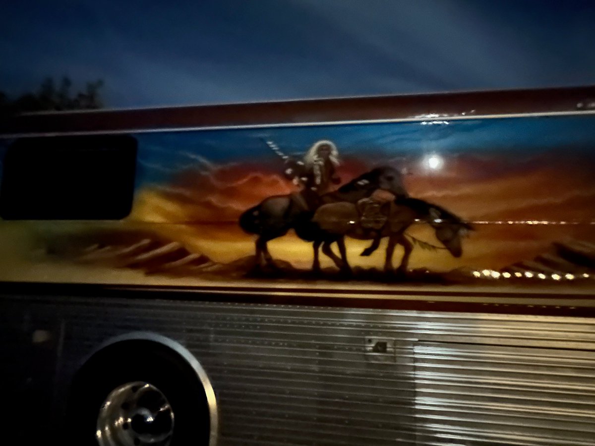 Here's a more competent photo of the "Honeysuckle Rose II," a Canadian-made 1990 Eagle Model 15 with custom interior by Florida Coach, and murals by an artist name "Rainmaker" (this is a car ID service after all). Willie's original tour bus was a 1983 Prevost that was totaled, without him in it. The various Honeysuckle Roses were all Prevosts: