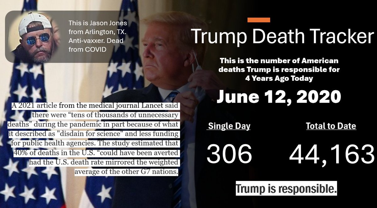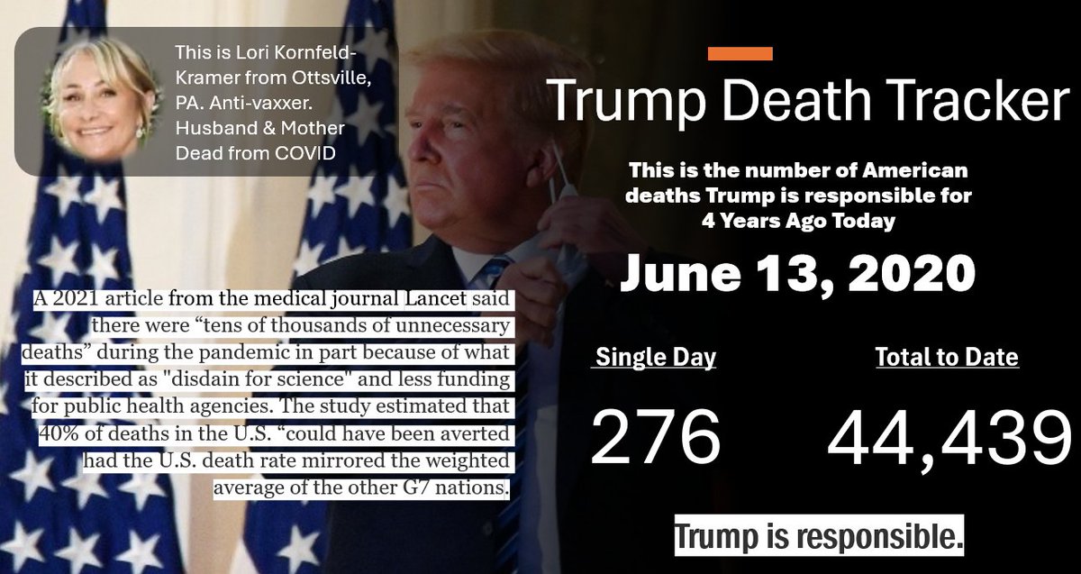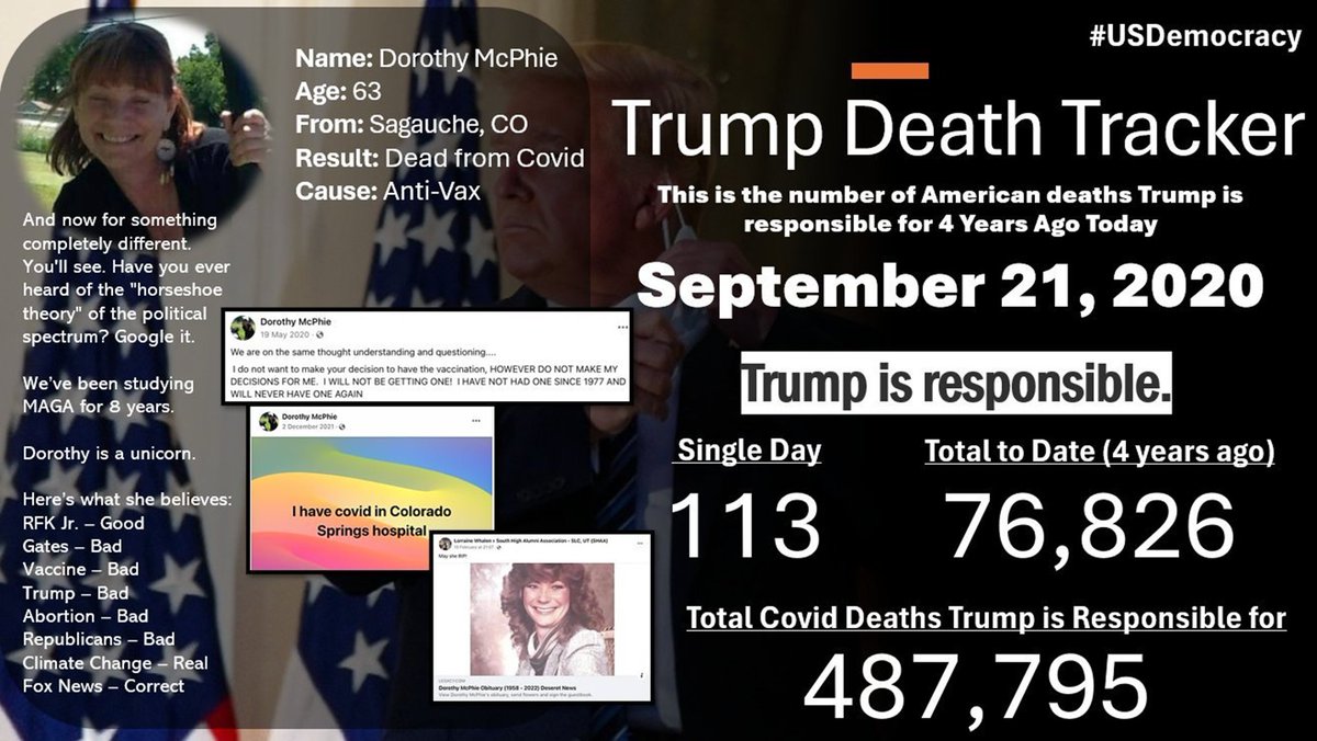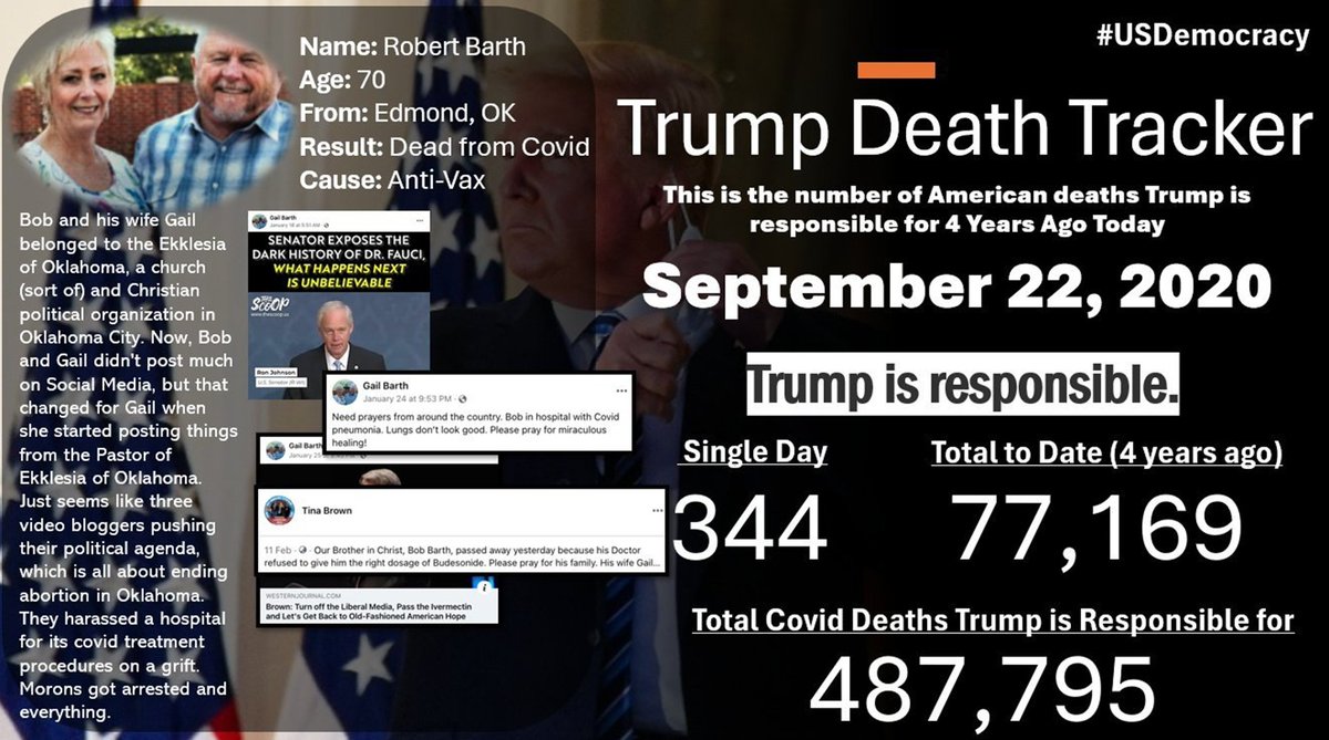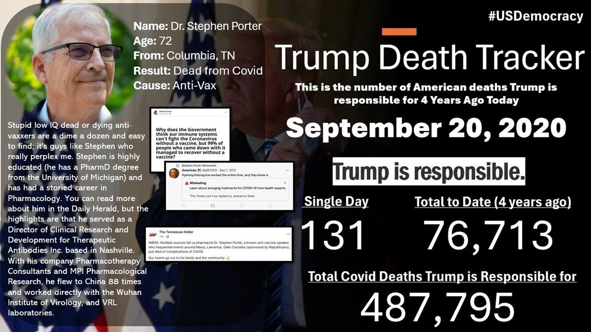 Please take some time this weekend and look at what Donald Trump did. Expert studies have shown that he's responsible for the deaths of nearly half a million Americans due to his mishandling and misinformation. Every one of these stories is a family Trump destroyed. #USDemocracy