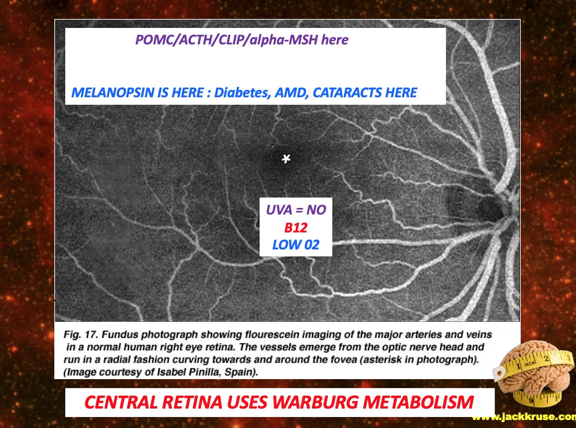The exclusion of mitochondria from the photoreceptor outer segment necessitates its reliance on glycolysis/PPP for cellular energy production, while still permitting information transfer from sunlight via protons with the H+ isoform in the retina and into the small structures of the brain mentioned above. There is a deep lesson here for the mitochondriac about how and why the retina where built as they were to work with hydrogen to make UV light inside our body to drive photonic programming of physiology. This is how information quanta is created and moved in the central retinal pathways to affect your brain and CSF pathways to build the world wide web in your head called your mind.
