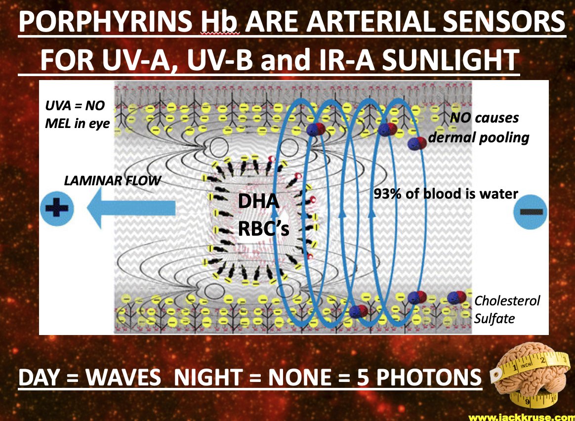 14. Since melanopsin is present in the eye, arteries of the skin and fat mass this becomes a critical point in understanding how the skin becomes the gatekeeper of deuterium flows from the blood plasma versus the tissue. Remember phototaxis is well known in the leaves of plants. Most third graders know that leaves grow toward light and can change their angle of inclination of growth toward sunlight based upon the type of sunlight present. Very few people realize that the RBC’s in mammals do the very same thing as leaves. This maybe why aneurysms form in arteries because RBC function differently when they are out of sunlight. Arteries should have laminar flow in the center of a vessel and why blood flow is more turbulent towards the artery wall. Sunlight causes the entire arteriole to migrate toward the sunlight of UVA light. Sunlight can directly affect the RBC’s in the center of your blood vessels to act just as leaves do to collect IRA and UVA light as a form of animal phototaxis.