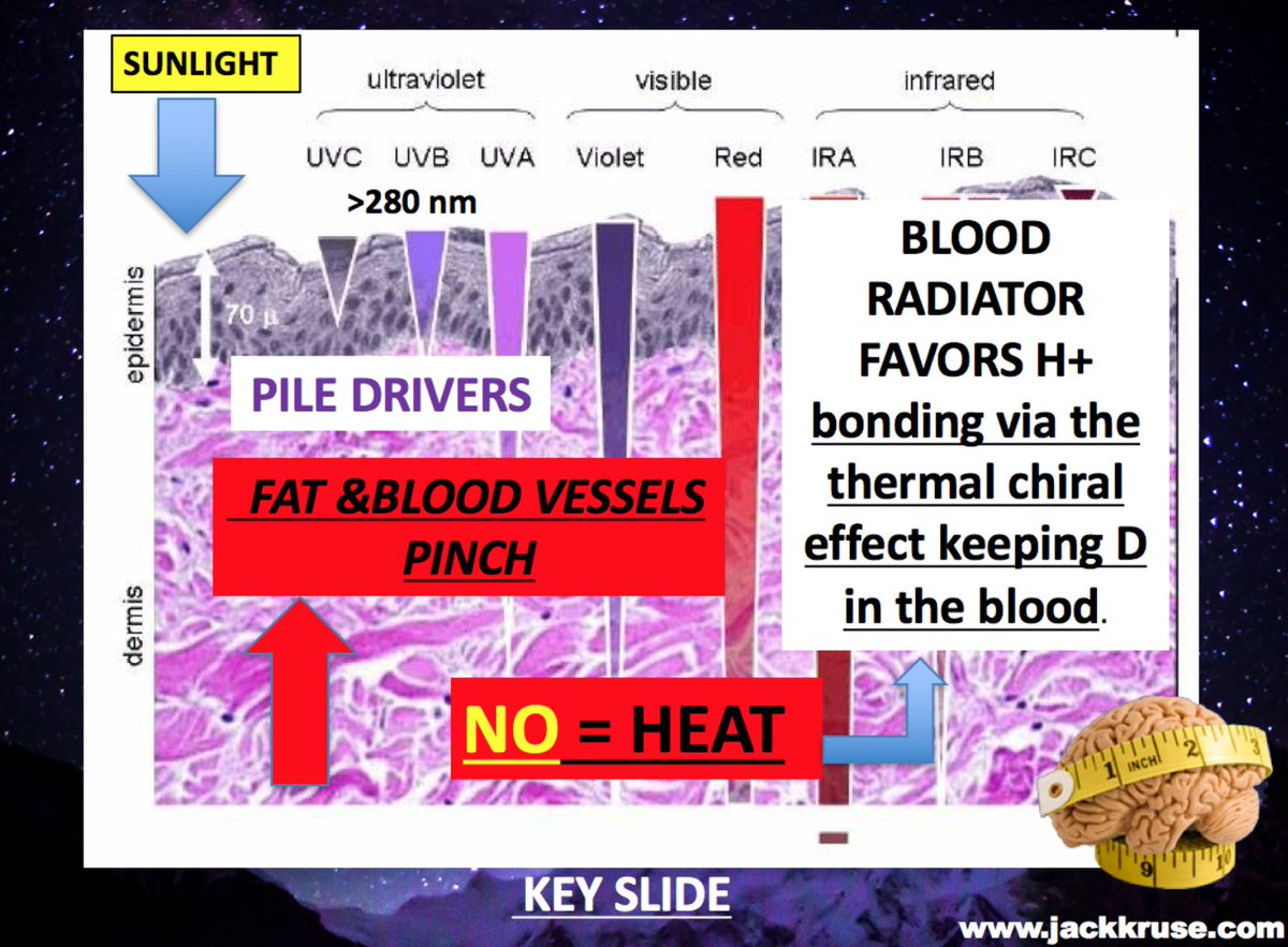 16. Having the innate ability to uncoupling your protons gradients helps keeps deuterium in the blood plasma because blood moves so rapidly, it can diffuse its heat like a radiator, but tissues do not have the same ability. This relative difference is all that is needed to control where isotopes of hydrogen should be found. When deuterium is trapped in the arterioles of the skin is can be pressurized by sunlight in the UV range and the chiral heat effect to pinch deuterium in the blood vessels coming to the surface, while at deeper levels H+ accumulation is favored in our tissues. Compression of H+ or deuterium allows the body to make a continuous UV spectrum from the isoform of hydrogen trapped in both tissues.