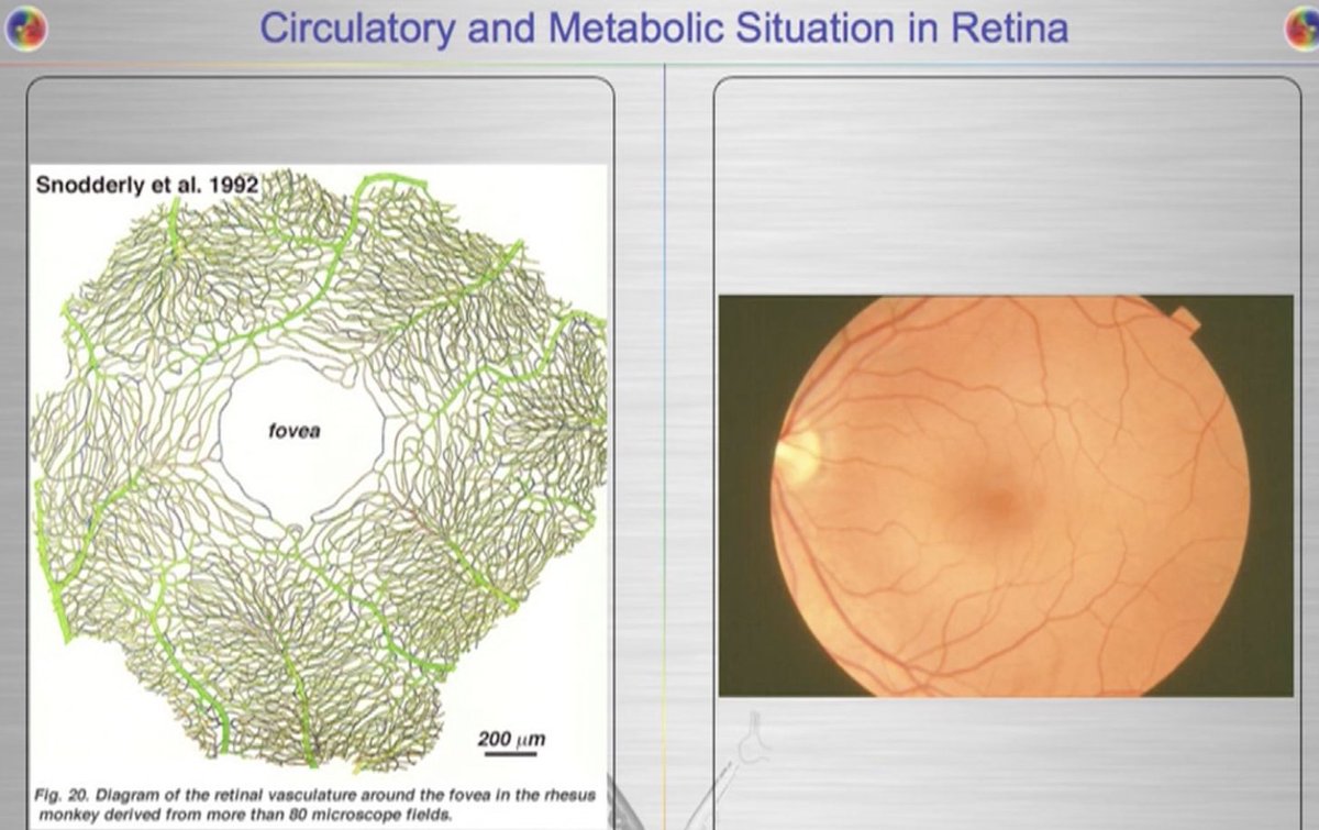 21. This is why the fovea/macula has a POOR blood supply. I showed those pictures last year in Vermont (above). How does the retina accomplish these thermodynamic gymnastics? It did exactly what the RBC did in evolution. It eliminated mitochondria from the cone cells while restricting blood flow to make sure no oxidative metabolism from the TCA/urea cycle could occur there. Any place mitochondria are located, deuterium, the heavier isotope of H+ must be sparse, and vice versa. This is tied to the quantum thermodynamics of the tissue in question.