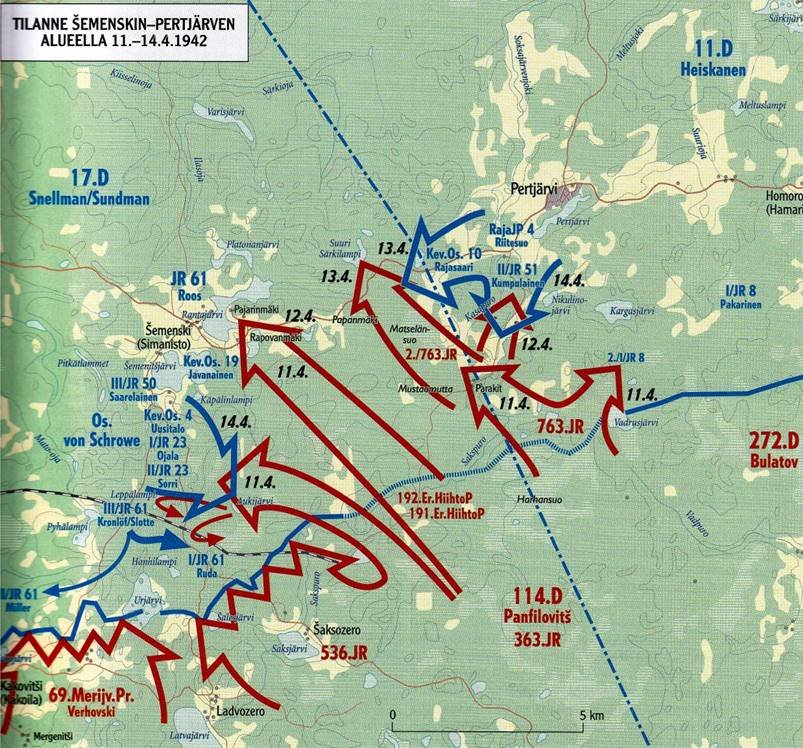 On one morning of April, after their platoon had repelled an attack, Pylkäs's platoon heard yells for help and sounds of heavy gun fire from direction of neighboring regiment the Finnish-Swedish JR 61.