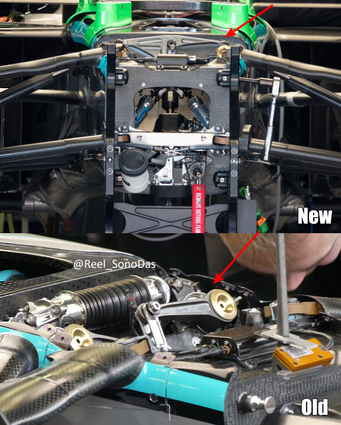 As far as I can tell, new rear end may be designed for more anti-squat and anti-lift, which could be in conjunction with new front wing and the need to re-balance the rear end at high speed - because more load is now generated at the front