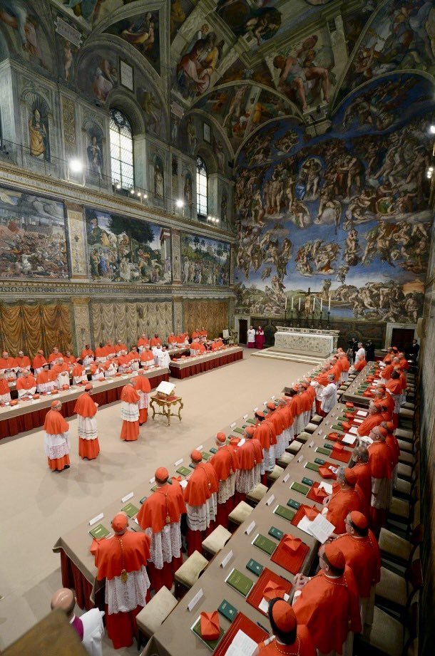 'Conclave' means locked with a key (Latin: cum clave). Cardinals are secluded in the Sistine Chapel under Michelangelo’s frescoes, swearing secrecy.