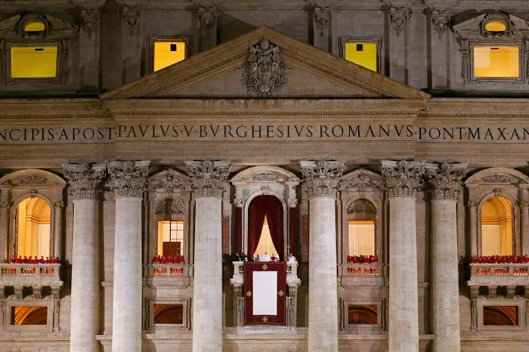 The Dean of Cardinals steps onto St. Peter’s balcony, announcing “Habemus Papam!” — We have a pope! He shares the pope’s name and chosen title, then the pope blesses the crowd.