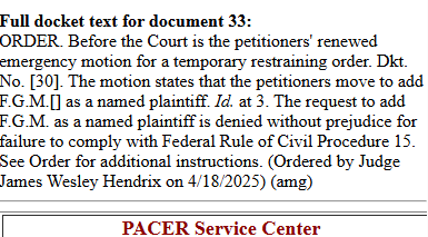 This was noted on the docket after Hendrix filed his order. Now it makes me wonder if Lee Gelernt did not do exactly the same thing with Judge Jeb Boasberg--which could explain Boasberg's quick action on March 15.